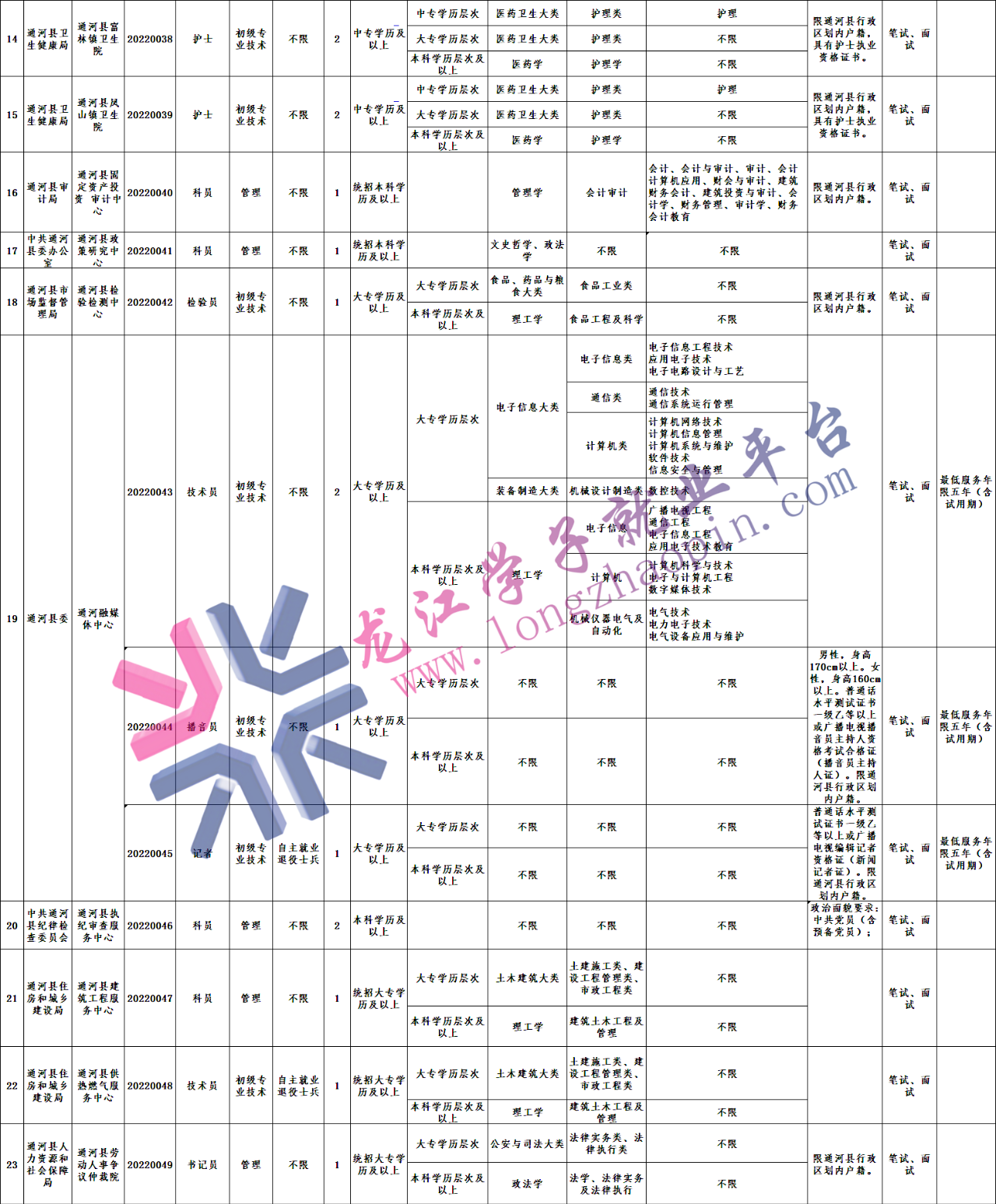除符合上述基本条件外,还应具备招聘岗位所需的学历、资格证书、户籍等其它资格条件(详见《招聘计划表》),《招聘计划表》中专业要求所列专业为“空”的,以其二级目录所列内容为准。其中限制哈尔滨市通河县行政区划内户籍计算时间截止为2022年7月5日。