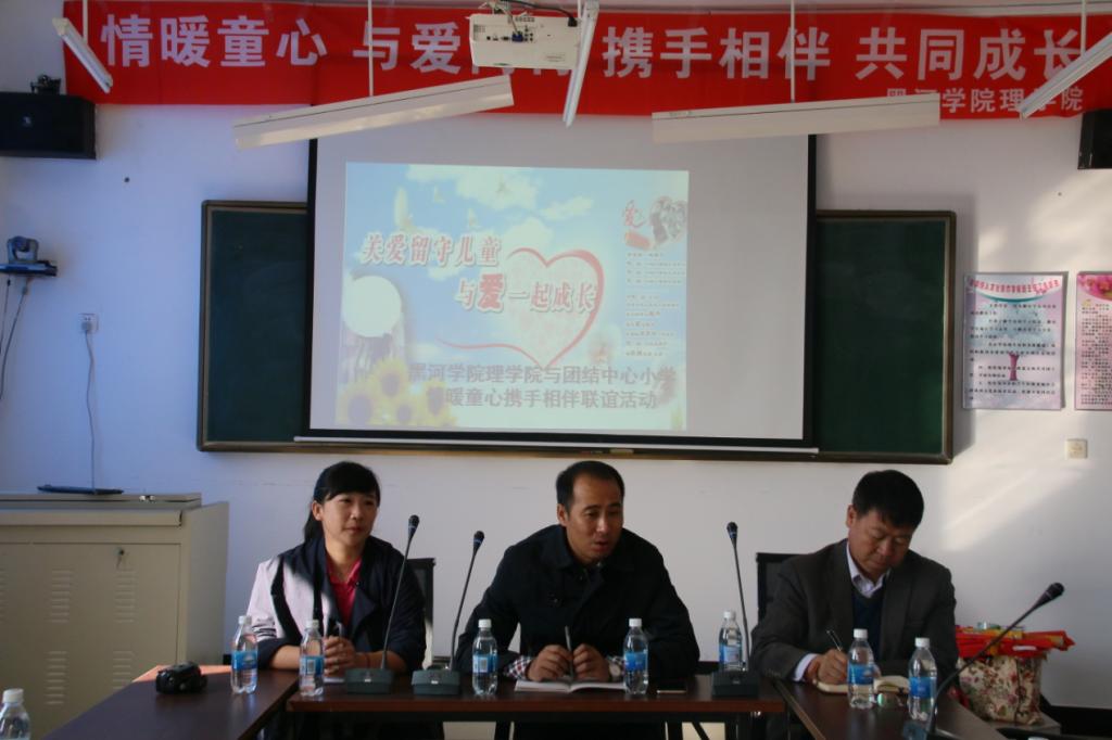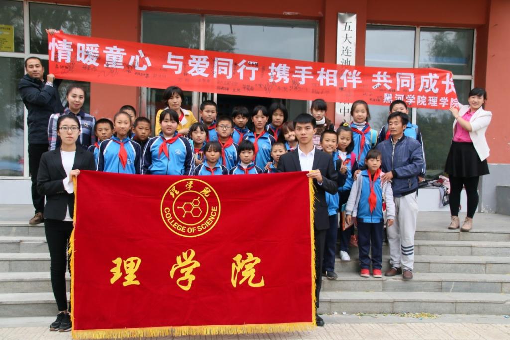 理学院“情暖童心,与爱同行,携手相伴,共同成长”关爱留守儿童赴五大连池团结小学志愿服务活动,在全体师生的共同努力下圆满结束。此次活动得到黑河实验教育集团五年一班全体师生的大力支持。实验集团和理学院全体师生捐赠的爱心礼物已经全部传递到每个留守儿童的手中,并完成了关爱留守儿童的系列心理团体活动和周恩来班班长的励志讲座。