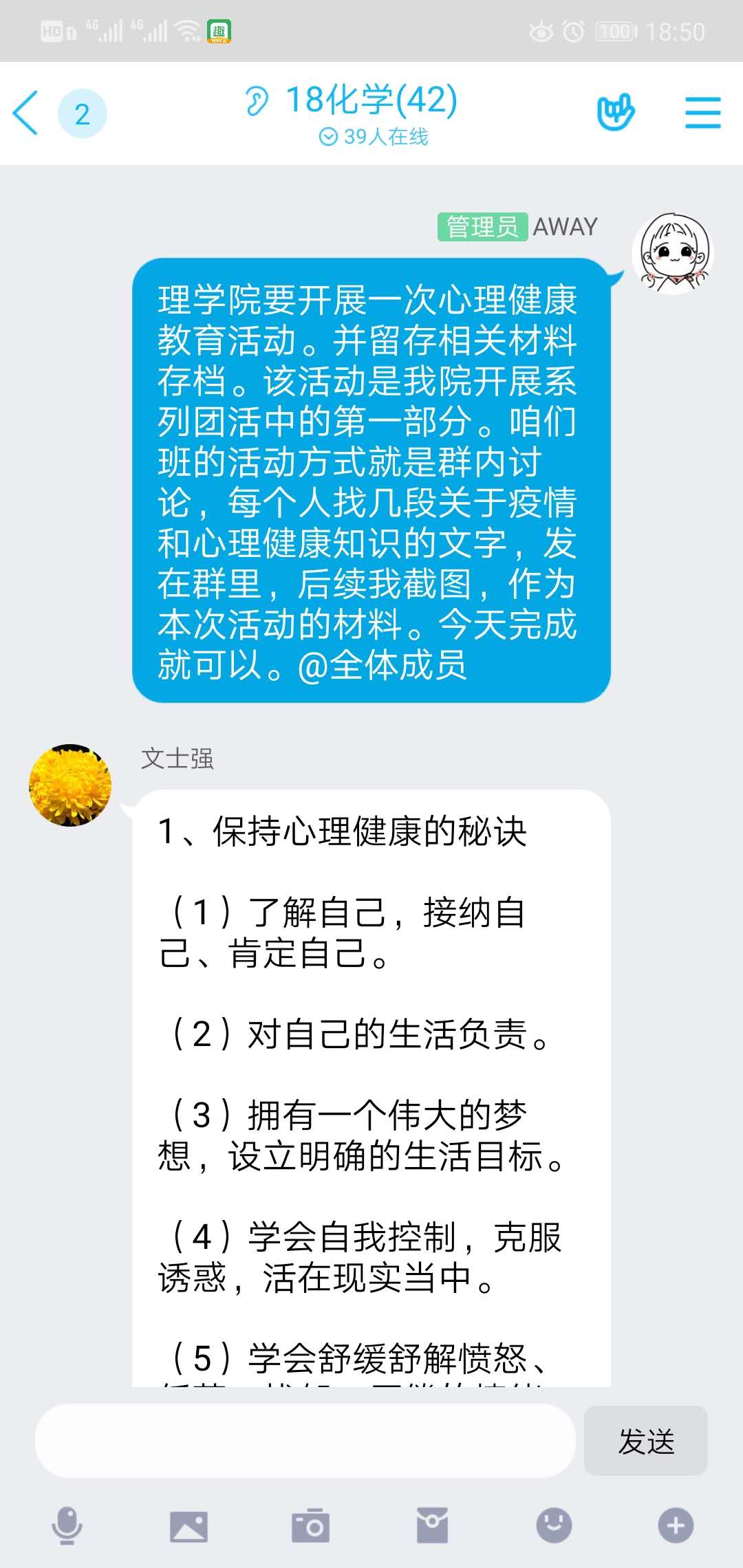 按照理学院团总支制定的“录好一个抗疫视频,讲好一个抗疫故事,开好一次抗疫会议,践行一份抗疫承诺”的工作部署,经过精心准备,周密部署,3月15日通过网络线上形式,如期召开了以“心理舒缓,同心抗疫”为主题的团活,此次团活的成功举办也标志着我院以“防疫抗 疫”为主题的系列团活正式拉开序章,在本次团活中,1430名在校学生全部参与其中,通过理论学习、情绪调节、心理舒缓、腹式呼吸、团体交谈与自我对话等环节,使学生们在这个特殊时期,舒缓了因居家隔离所带来的心理压力,感受到了理学院为同学们精心准备的“心”的温暖。