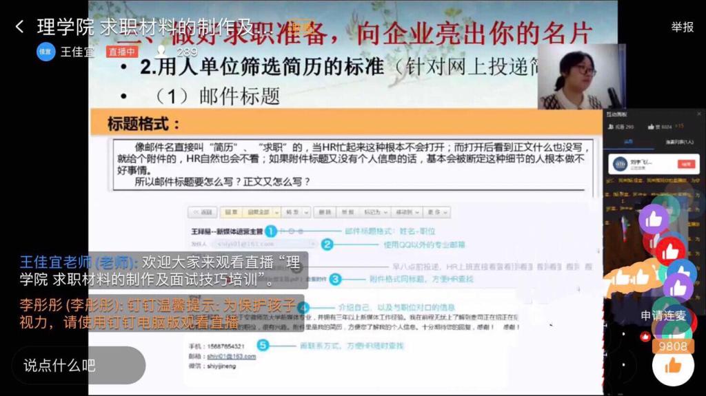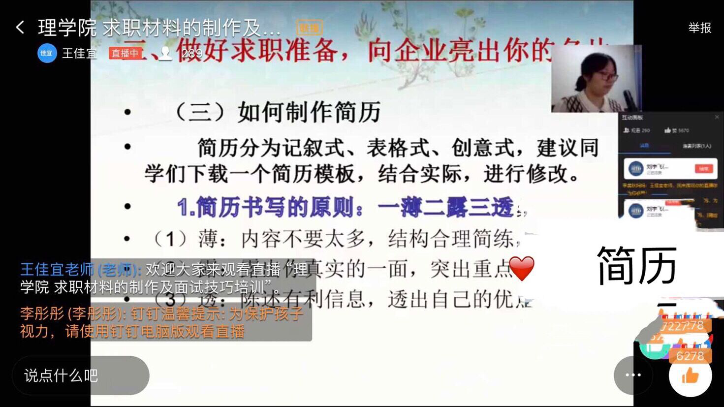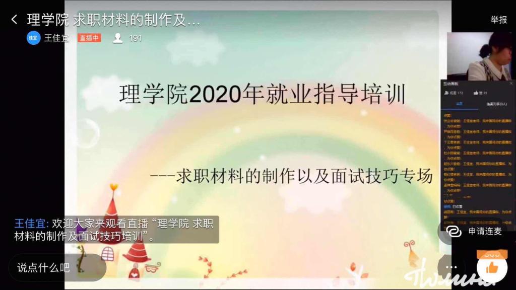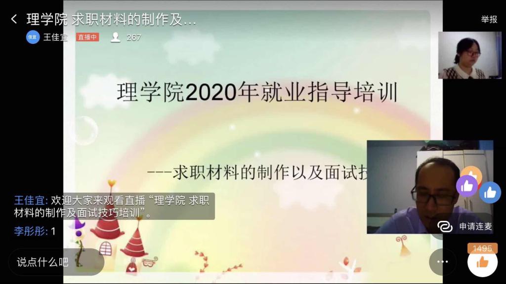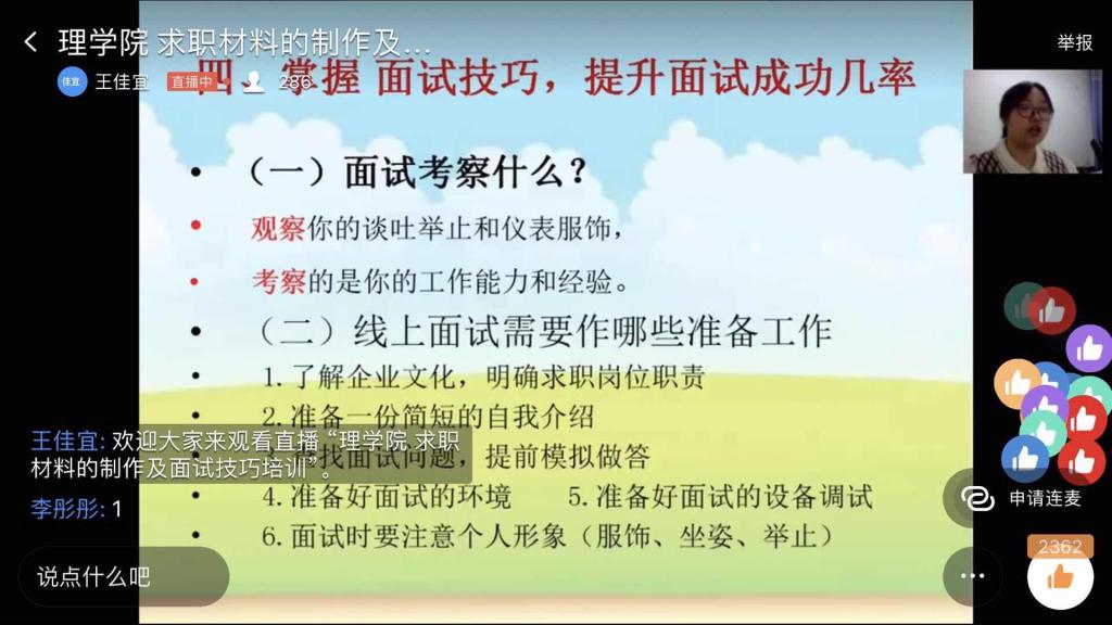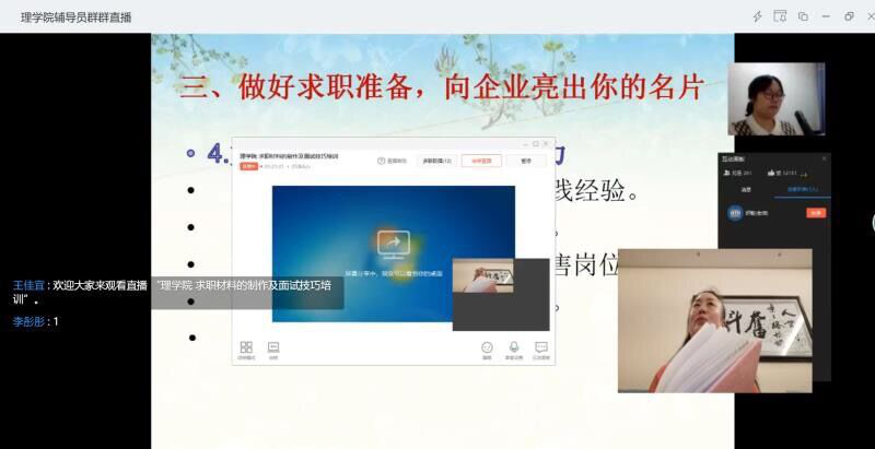 在疫情防控的特殊时期,为帮助我院毕业生进一步认清严峻的就业形势,掌握线上求职材料的制作及面试技巧,更好的解决在就业中面临的各种困难。按照理学院就业工作方案部署安排,3月30日晚,理学院通过钉钉直播平台举办了“求职材料的制作和面试技巧培训会”,本次培训会由辅导员王佳宜老师主讲,刘宇飞老师主持,理学院院长邱敏、党总支书记李珊、学校包保就业教师、全院就业指导教师及2016级学生参加了本次培训会。