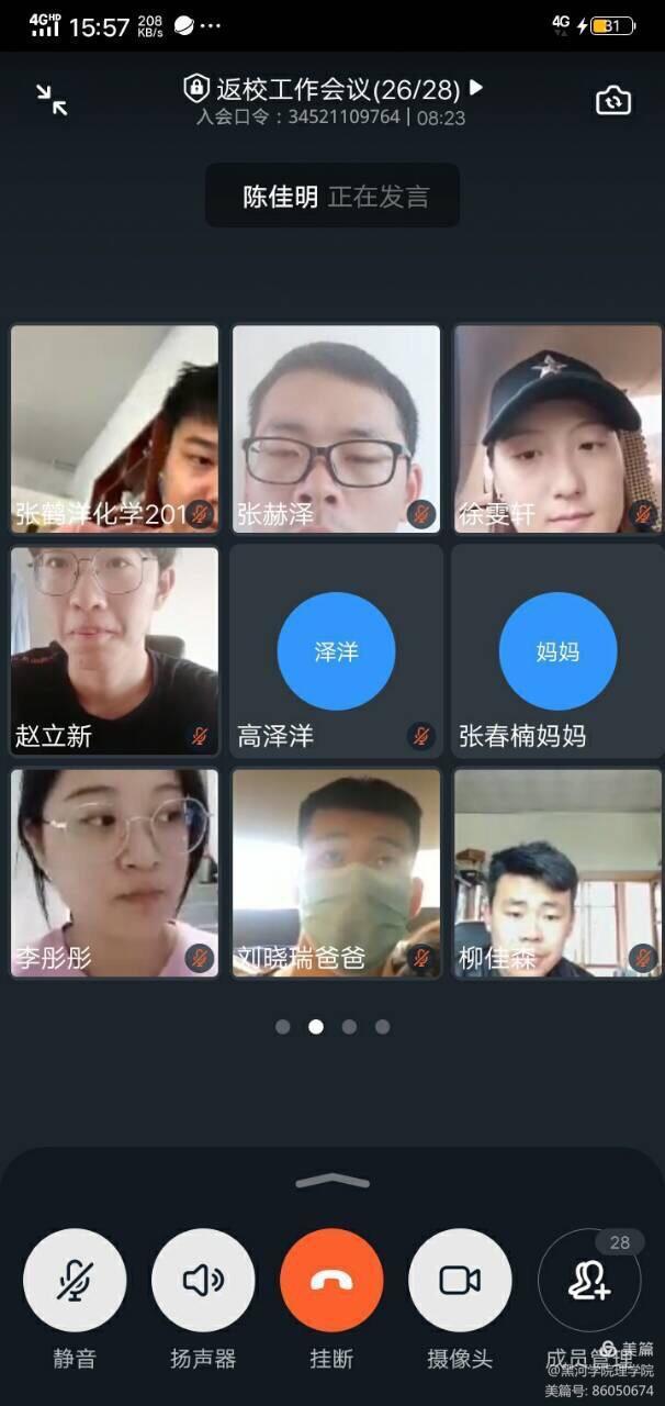 理学院辅导员陈佳明老师通过钉钉会议向学生传达《黑河学院2020年秋季学期学生返校工作方案》内容,并对学生在返校之前、返校途中、返校以后的注意事项进行逐一讲解,提示返校同学在返校途中做好个人安全防护,返校后遵守学校的规章制度,积极配合学校疫情防控工作。