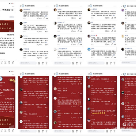 为丰富“网上重走长征路”暨推动“四史”学习教育活动内容,我院通过美篇公众号推出龙江“四大精神”系列学习内容,为增强学习的影响力和学习效果,我院学生干部带头转发并进行评论,引导学生用心感悟龙江精神,持续深化爱国主义教育,同时号召同学们积极关注龙江高校网络思政中心微信公众号,在我院上下形成学习“四史”的热潮,传承红色基因,激发爱国情怀。