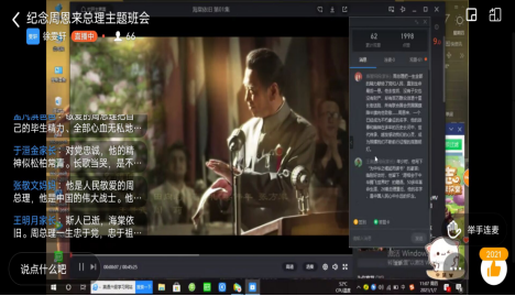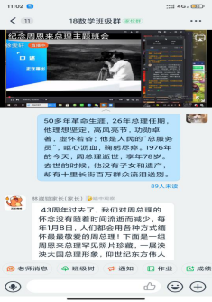 我院“周恩来班”(2018级数学班),召开钉钉线上主题班会,精心设计学习内容,在感悟周总理精神的同时,为工作在一线的抗疫工作者表示崇高的敬意。同学朗诵《一月的哀思》节选内容,表达对周总理的深切怀念之情;收看专题纪录片《榜样--周恩来的故事》,进一步感悟周总理精神的丰富内涵;收看视频后同学们交流感想,分享心得,流露出对周总理生平事迹的敬佩仰慕之情;在班会的最后环节,同学们为黑河奋战在抗疫一线的工作人员点赞,并祝福黑河这座风景如画的小城,早日“康复”,期待春暖花开,重聚黑河学院。