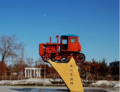 1949年3月,东北行政委员会派农业部秘书丰年同志到嫩江县创办鹤山农场。先遣人员只有9人,在茫茫的雪原上,他们架起了第一顶帐篷,迎接北大荒的暴风雪。3月3日,9个人举行了建场典礼,对空鸣枪3声,作为庆贺的礼炮,9个人把9双手紧紧握在了一起,从此,荒原上响起了春天的歌声。