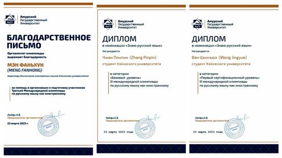 本网讯(特约记者修云明)近日,俄罗斯阿穆尔国立大学组织的“第三届国际俄语奥林匹克竞赛”落下帷幕,比赛以线上形式举行,吸引了来自中国、俄罗斯、白俄罗斯、土库曼斯坦、埃及、印度尼西亚、加蓬、越南等国家的30多所中外高校上百名学生参赛,我校外国语学院学生王竞悦在“我能听懂俄语”中荣获一级奥赛证书,张萍萍荣获基础级别奥赛荣誉证书;理学院77名学生荣获国际数学奥林匹克竞赛荣誉证书,其中蒋昕格荣获国际数学奥林匹克竞赛“优秀奖”;外国语学院院长孟繁红、俄语系主任姜丹、理学院数学系主任刘君等多位老师获得“优秀组织者”荣誉称号。