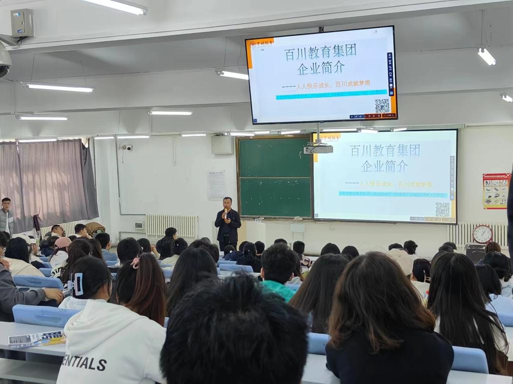 于佳鑫(上海新华进修学院分校校长)做校友宣讲。会议结束后百川教育副校长李士伟、新华进修学院副院长赵丽、华灿光电校招经理葛亮分别开展求职观、就业观、职场发展主题讲座。