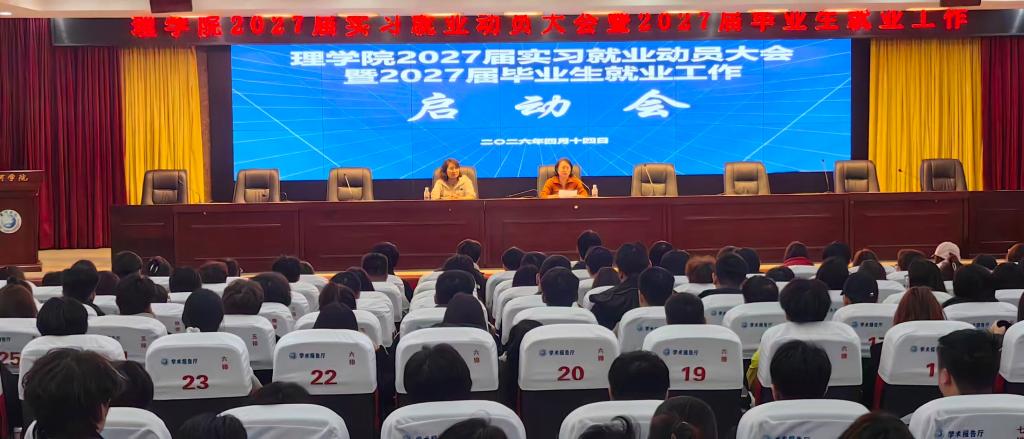 为深入贯彻落实《人力资源社会保障部 财政部关于做好2026年高校毕业生等青年就业工作的通知》及《教育部关于加强和规范普通本科高校实习管理工作的意见》精神,扎实推进2027届毕业生实习与就业工作,帮助学生精准把握就业形势、明晰政策要求、科学规划学业进程,2026年4月14日18时,黑河学院理学院在求知楼报告厅隆重召开“2027届实习就业动员大会暨毕业生就业工作会议”。理学院邱敏院长、张秀平副院长及全体2027届毕业生参会。