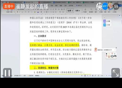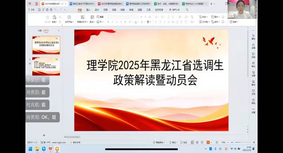 为进一步引导、鼓励和支持毕业生赴基层就业,做好赴基层就业毕业生的爱国教育、诚信教育和理想信念教育,理学院于2025年2月16日17时通过钉钉平台组织召开理学院2025年黑龙江省选调生政策解读暨动员大会。会议由理学院学生工作办公室副主任崔静老师主讲,理学院党总支书记刘宇飞、辅导员于鹏飞、张馨予及2025届毕业生参加了此次动员会。