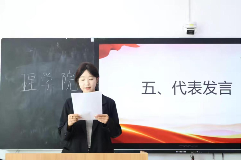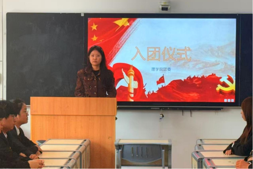 仪式正式启幕,理学院团委负责人以主持人身份登场。他语调严谨不失亲切,在清晰宣布仪式开始后,将拼搏场景、热血精神与共青团员需扛起的责任担当深度联结,用生动的联结唤醒在场人员的共鸣,激起了学生的参与热情与使命感。随后,全体肃立,齐声高唱《中国共产主义青年团团歌》,歌声嘹亮,充满理想与信念的力量,在教室中久久回荡。