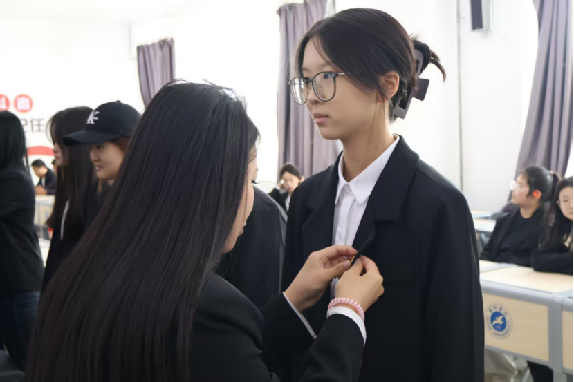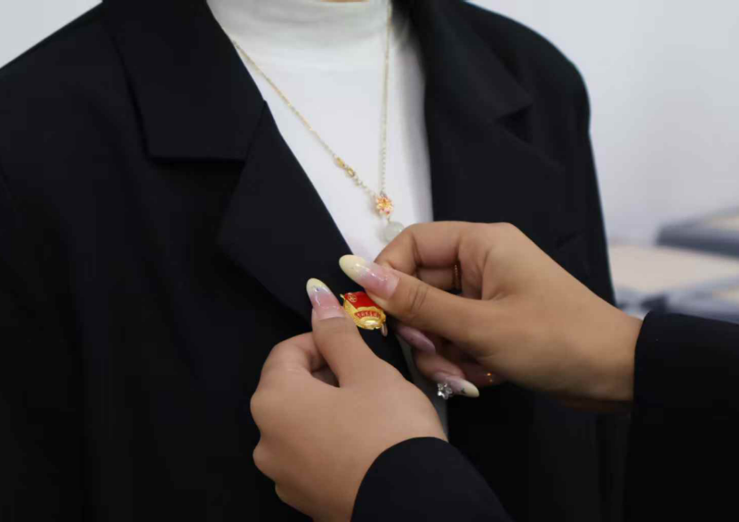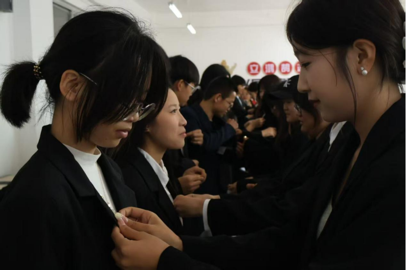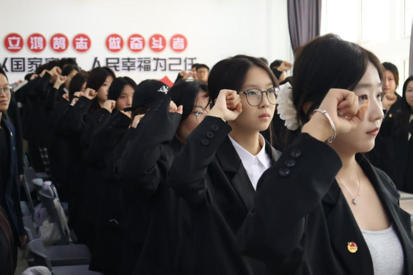 优秀团员代表走到台前,以清晰有力的声音宣读新团员名单。每当一个名字被念出,对应同学立即起立应答,现场随即响起热烈而诚挚的掌声,表达对他们的肯定与欢迎。随后,由资深团员代表为新团员逐一佩戴团徽。面对鲜红的团旗,新团员们高举右拳,用坚定而洪亮的声音庄严宣誓,其中“以‘崇德明理,志在四方’的信念,践行团员使命”的誓言,将运动场上的拼搏精神与团员的责任担当紧密相连,表达了他们立志为集体、为社会贡献力量的决心。