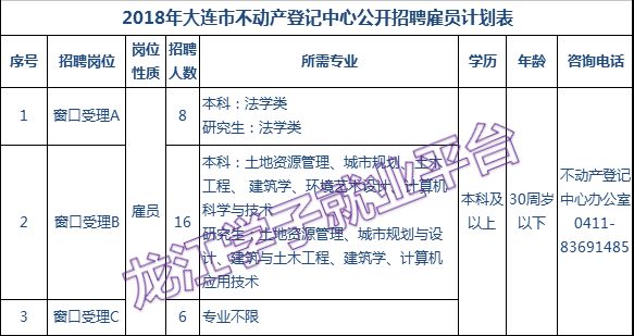 招聘岗位具体条件详细情况见《2018年大连市不动产登记中心公开招聘雇员计划表》。
