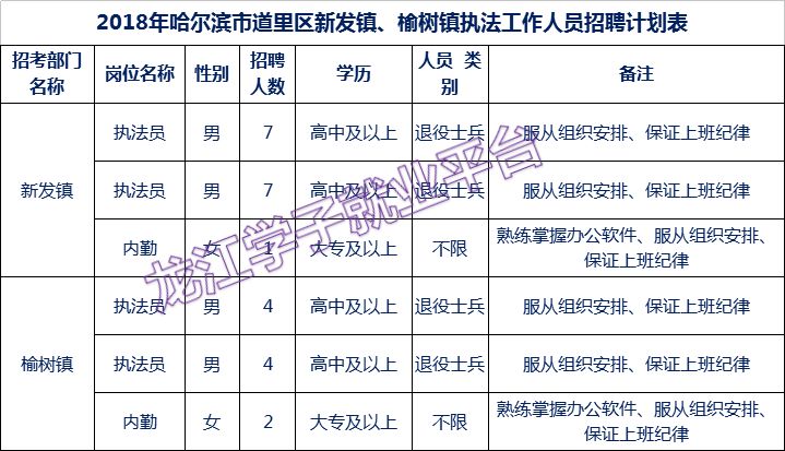 此次招聘人员均为财政供养非在编人员,合计招聘25人,具体招聘岗位、人数、条件等详见《2018年哈尔滨市道里区新发镇、榆树镇执法工作人员招聘计划表》。(以下简称《招聘计划表》)