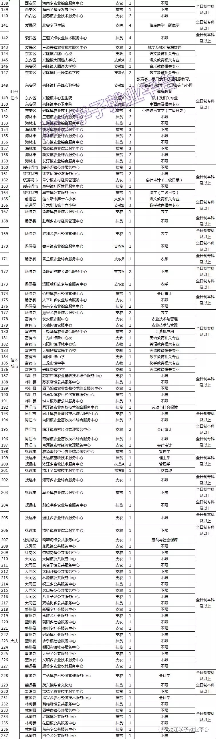 4.满足岗位要求的学历、专业等资格条件。其中,报考初中支教岗位,应具有全日制普通高校本科及以上学历,同时应取得与岗位学科要求一致的初级中学及以上种类的教师资格证书;报考小学支教岗位,应具有全日制普通高校专科及以上学历,同时应取得与岗位学科要求一致的小学及以上种类的教师资格证书;报考支医岗位应为医疗类专业毕业生。