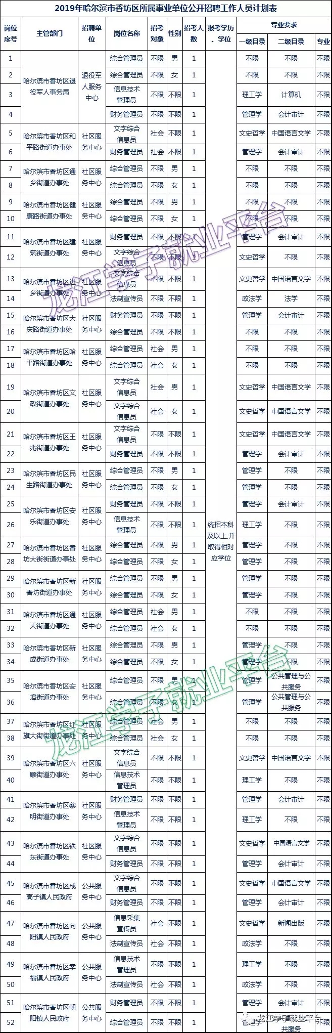 此次公开招聘事业单位工作人员52人,具体招聘岗位、人数、条件等详见《2019年哈尔滨市香坊区所属事业单位公开招聘工作人员计划表》(以下简称《招聘计划表》)。