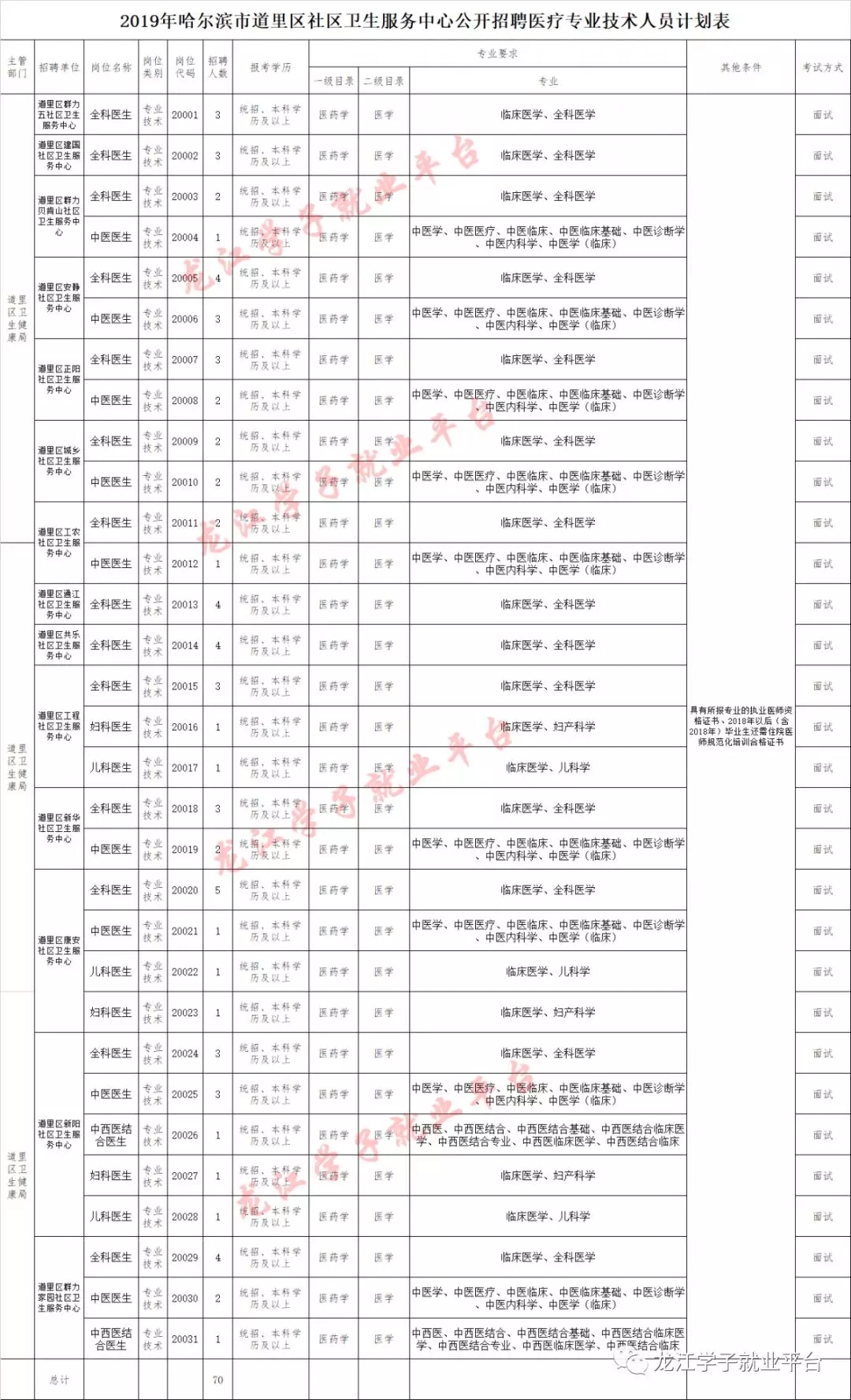 招聘医疗专业技术人员70人,详见《2019年哈尔滨市道里区社区卫生服务中心公开招聘医疗专业技术人员计划表》。
