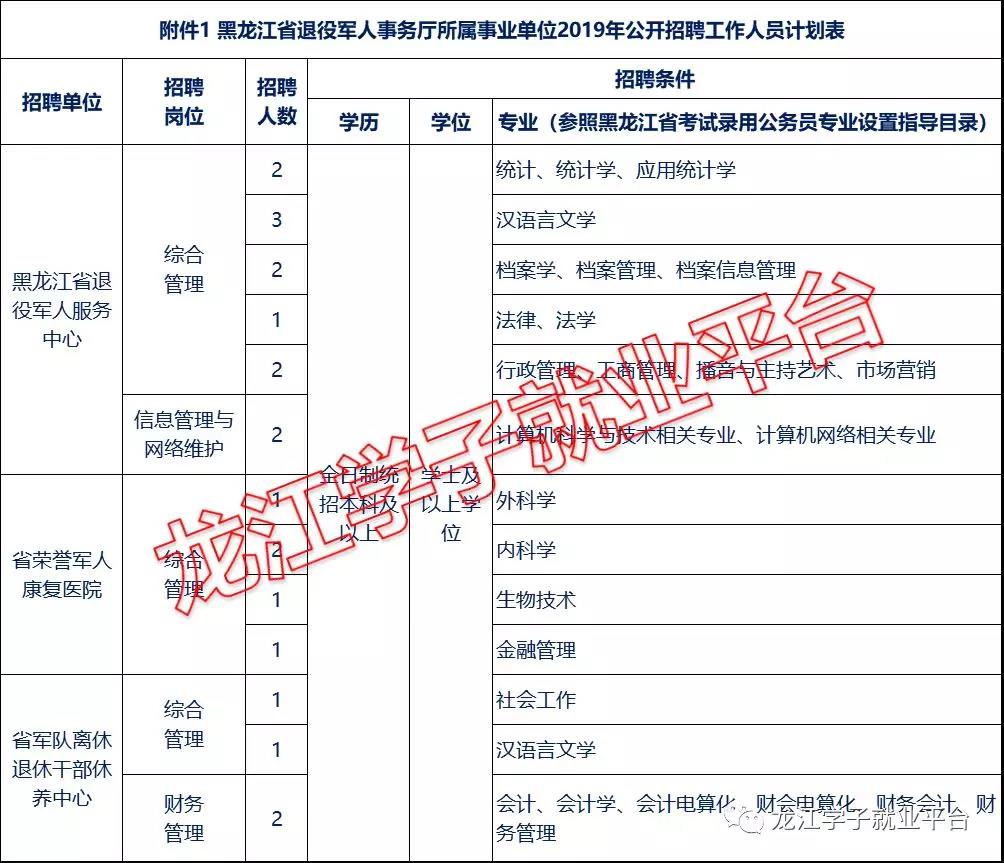 8.具备招聘岗位所需要的其他条件。(详见《黑龙江省退役军人事务厅所属事业单位2019年公开招聘工作人员计划表》)