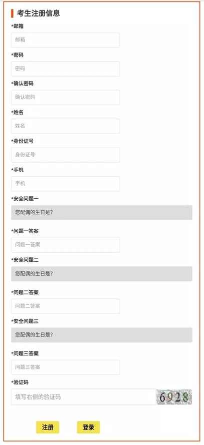 2.考生注册信息填报。考生需认真填写邮箱、姓名、身份证号、手机号码等信息,以上信息注册成功后将自动生成至报名基本信息中且无法更改。考生需提供本人手机号码,并保持畅通。牢记密码后单击 “注册”,注册成功后系统弹出“注册成功!请登录并完善个人基本信息”。点击“关闭页面提示信息”进入报名系统或重新进入报名网址: