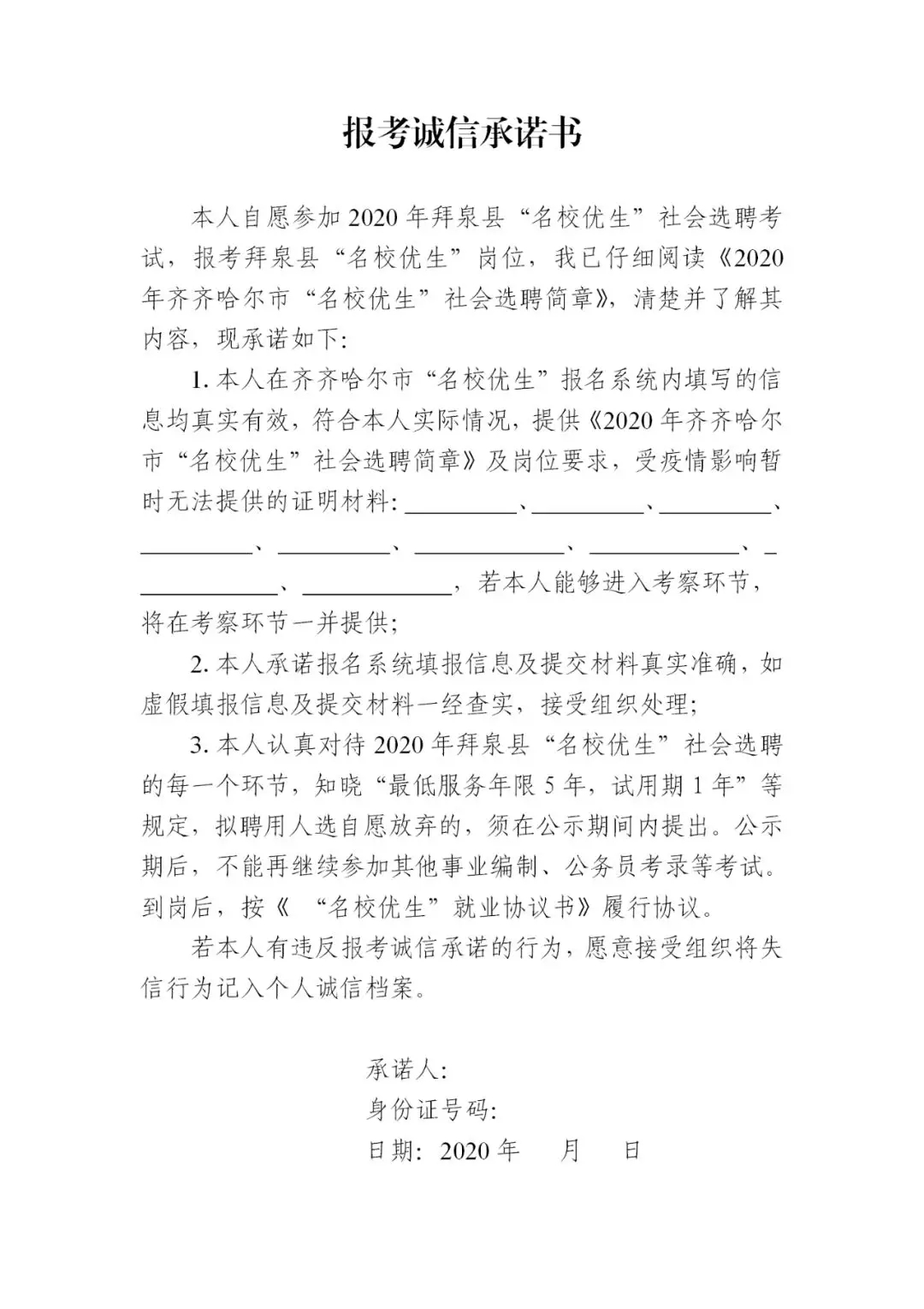 报考拜泉县“名校优生”需考生提供自荐信,内容主要包括个人性格特点、工作业绩、选择报考拜泉县的原因等(不含基本信息能明确体现的内容)。