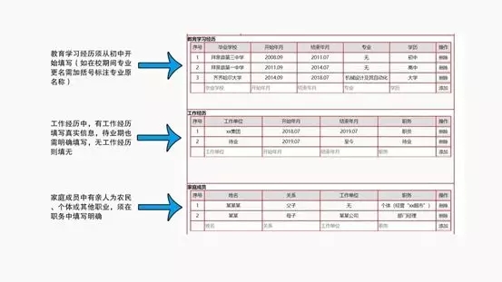 教育经历从初中开始填写(包括初中),工作经历连续填写,待业情况需如实填写。家庭成员包含配偶、子女、双方父母,信息需填写完备,个体经营户要写清具体从事行业或商店名称,农民要具体到行政村。