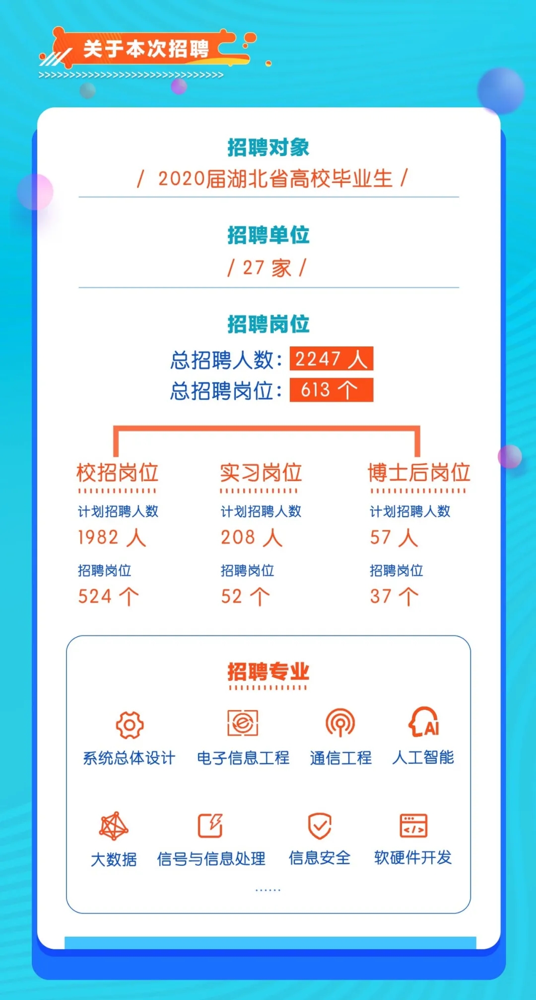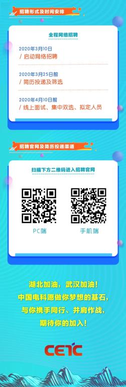 此次活动是中国电科深入贯彻习近平总书记关于新冠肺炎疫情防控工作的重要指示批示精神,坚决落实党中央国务院决策部署,切实履行社会责任,助力湖北高校毕业生就业工作的实际行动。专场招聘活动除提供大量就业岗位外,还提供了一批实习岗位和博士后进站研修机会。同时,实现“一网通办”,在线简历投递、在线面试、在线签约……最大程度方便学生就业。
