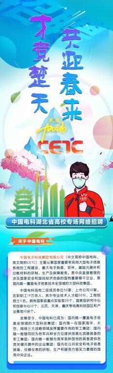 3月10日,中国电科精心打造的面向湖北省高校应届毕业生的“才竞楚天 共迎春来”专场网络招聘活动正式启动,网络招聘平台也同步上线。