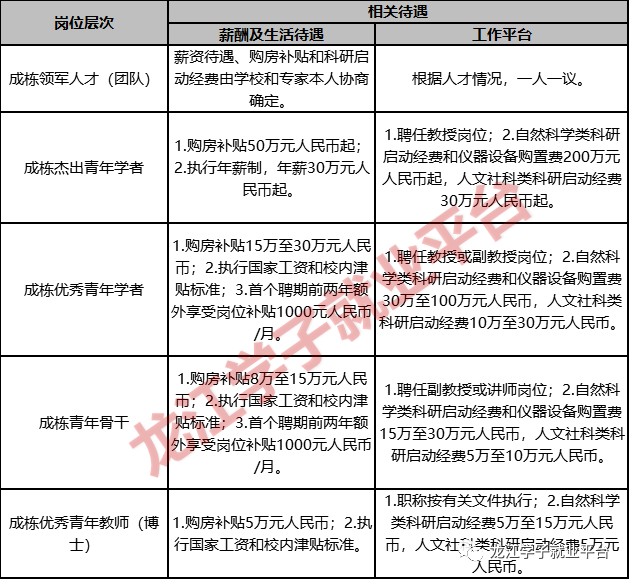 “成栋英才引进计划”招聘各岗位均为学校事业编制,实行聘用合同制,具体待遇如下: