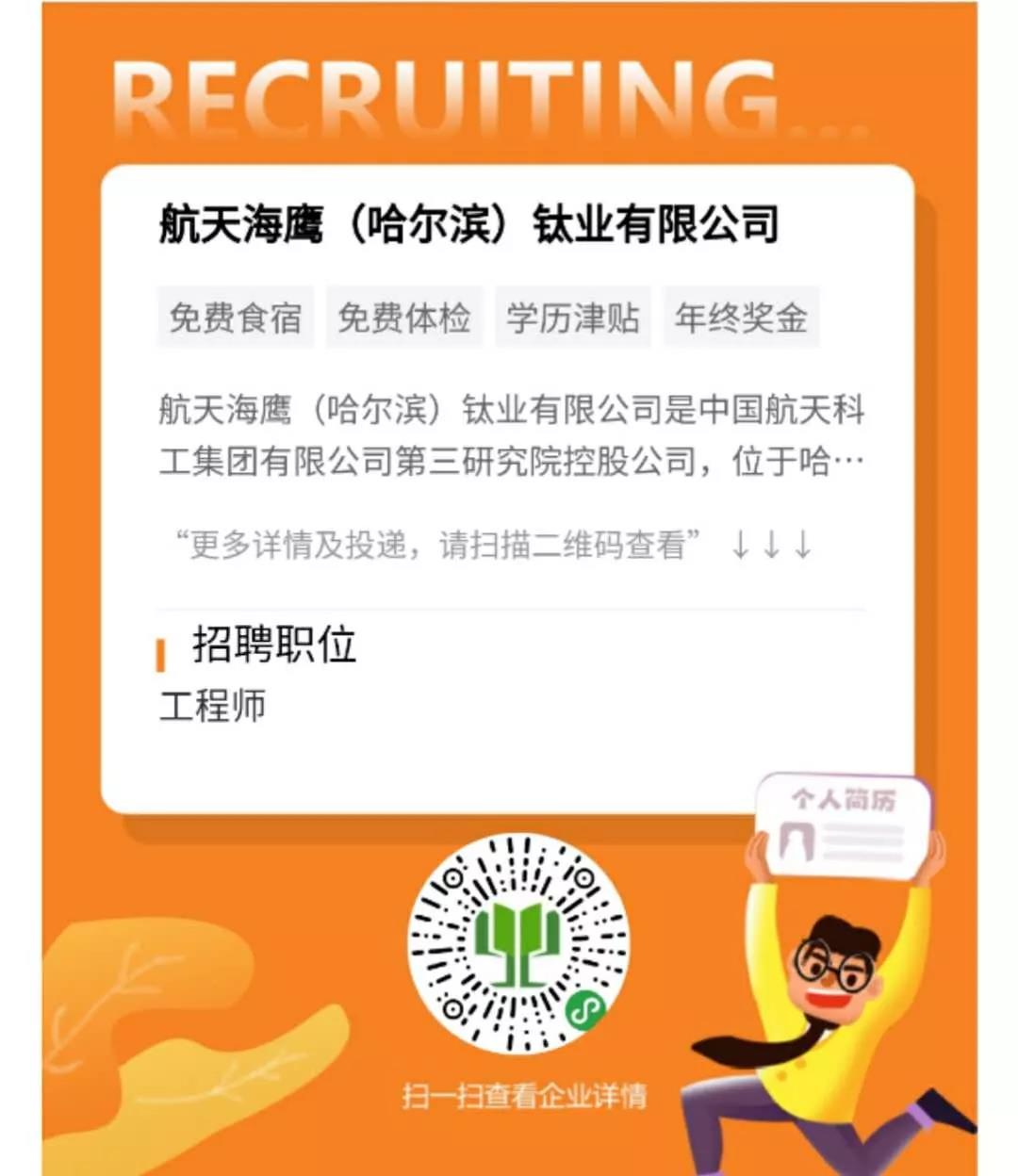 航天海鹰(哈尔滨)钛业有限公司是中国航天科工集团有限公司第三研究院控股公司,位于哈尔滨新区核心区,成立于2013年4月,注册资金7亿元,占地33万平方米,一期建设面积6.2万平方米,是集研发、设计、制造、服务为一体化的钛产业基地。公司主营业务包括钛合金及高温合金精密铸造、板焊成型与集成制造、粉末冶金与增材制造、高效换热器装备设计制造等专业领域,是国家级高新技术企业,军民品科研生产资质齐全。现有从业人员300余人,其中具有高级职称和研究生以上学历的各类专业技术人员60余人。公司拥有黑龙江省钛合金材料及热工艺工程技术研究中心和哈尔滨市钛合金精密塑性成型公共服务平台。