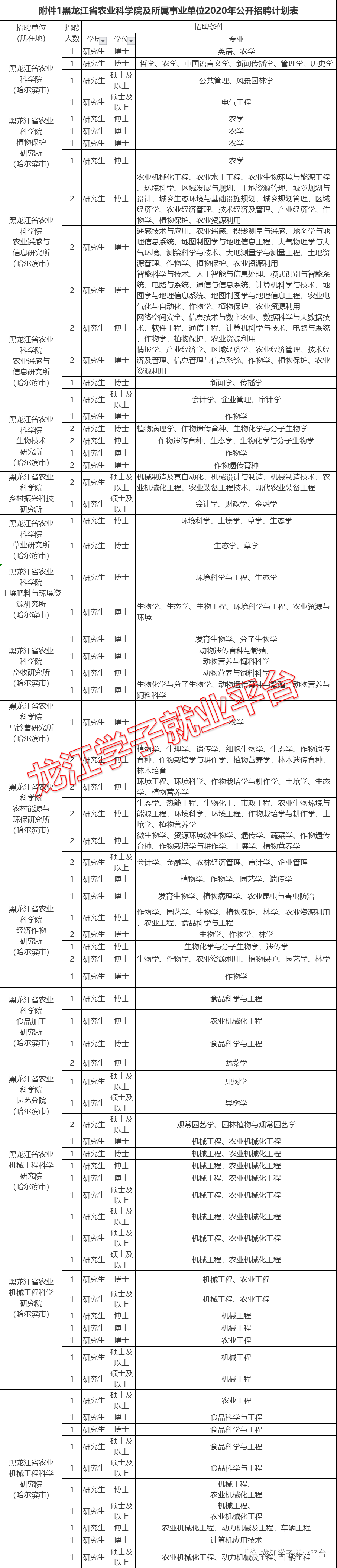 详见附件《黑龙江省农业科学院及所属事业单位2020年公开招聘计划表》。