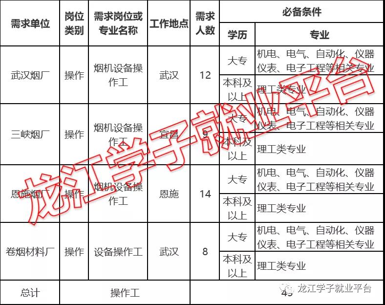 根据中央和国务院关于稳就业的相关政策,贯彻落实国家烟草专卖局的工作部署,2020年湖北中烟拟补充招聘操作类岗位43人。