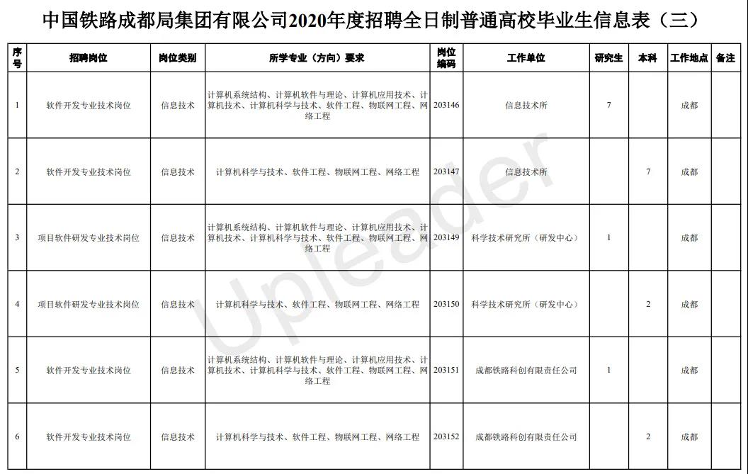 本批次计划招聘20人,具体岗位及要求详见附件《中国铁路成都局集团有限公司2020年度招聘全日制普通高校毕业生信息表(三)》。