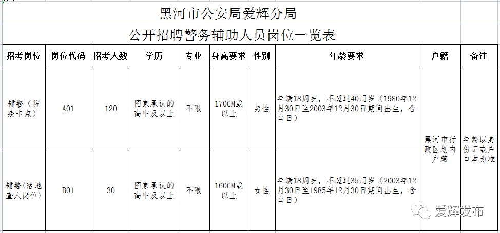 为有效缓解黑河市爱辉区警力不足的现状,提升公安机关维护社会稳定、服务区域经济发展的能力,经爱辉区政府研究决定,面向社会为黑河市公安局爱辉分局公开招聘公安警务辅助人员150名(以下称辅警)。结合爱辉区实际用人需求,制定本公告。