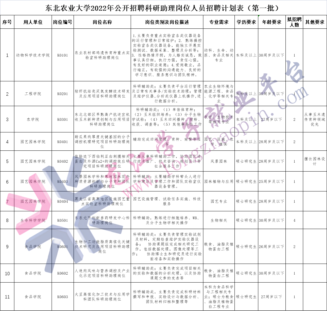 (六)招聘具体条件和申报年龄,详见附件1《东北农业大学2022年公开招聘科研助理岗位人员招聘计划表》(第一批)。