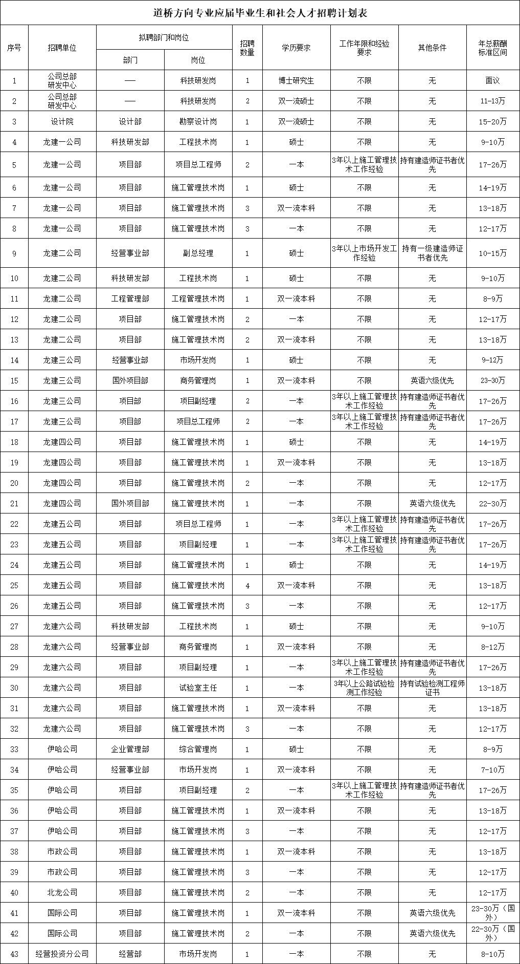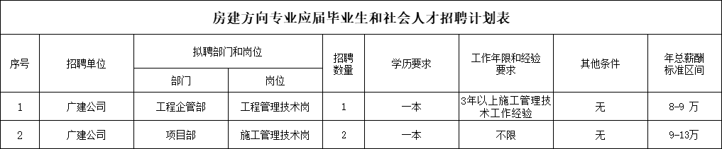 面向应届高校毕业生和社会人才,招聘所学专业为道桥方向的第一批次录取的本科生(简称一本)、全日制硕士研究生和博士研究生68人,其中一本毕业生55人(“双一流”院校本科生18人以上),硕士研究生12人(“双一流”院校硕士研究生3人以上)和博士研究生1人;招聘所学专业为房建方向的一本毕业生3人,具体详见招聘计划表(附件1)。