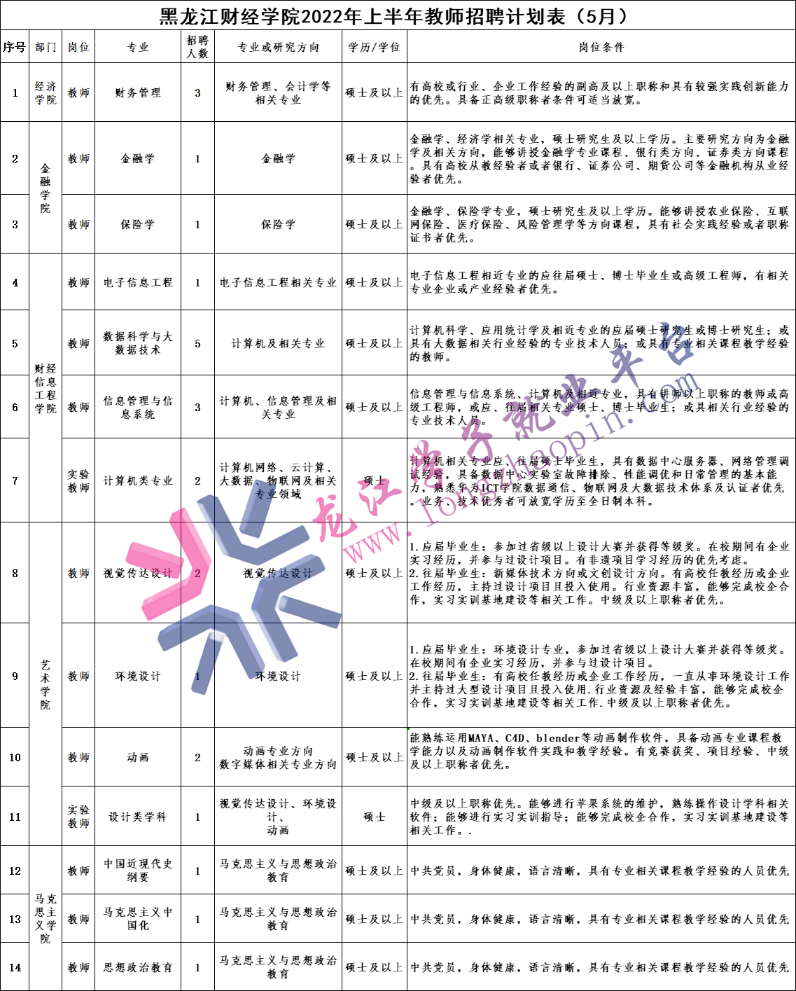 各招聘岗位招聘具体条件,详见《黑龙江财经学院2022年上半年教师招聘计划表》(附件1)。