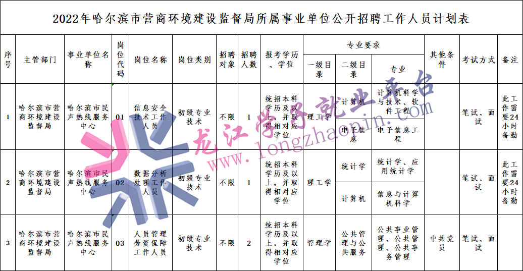 此次公开招聘事业单位工作人员4人。具体招聘岗位、人数、条件等详见《2022年哈尔滨市营商环境建设监督局所属事业单位公开招聘工作人员计划表》(以下简称《招聘计划表》)。