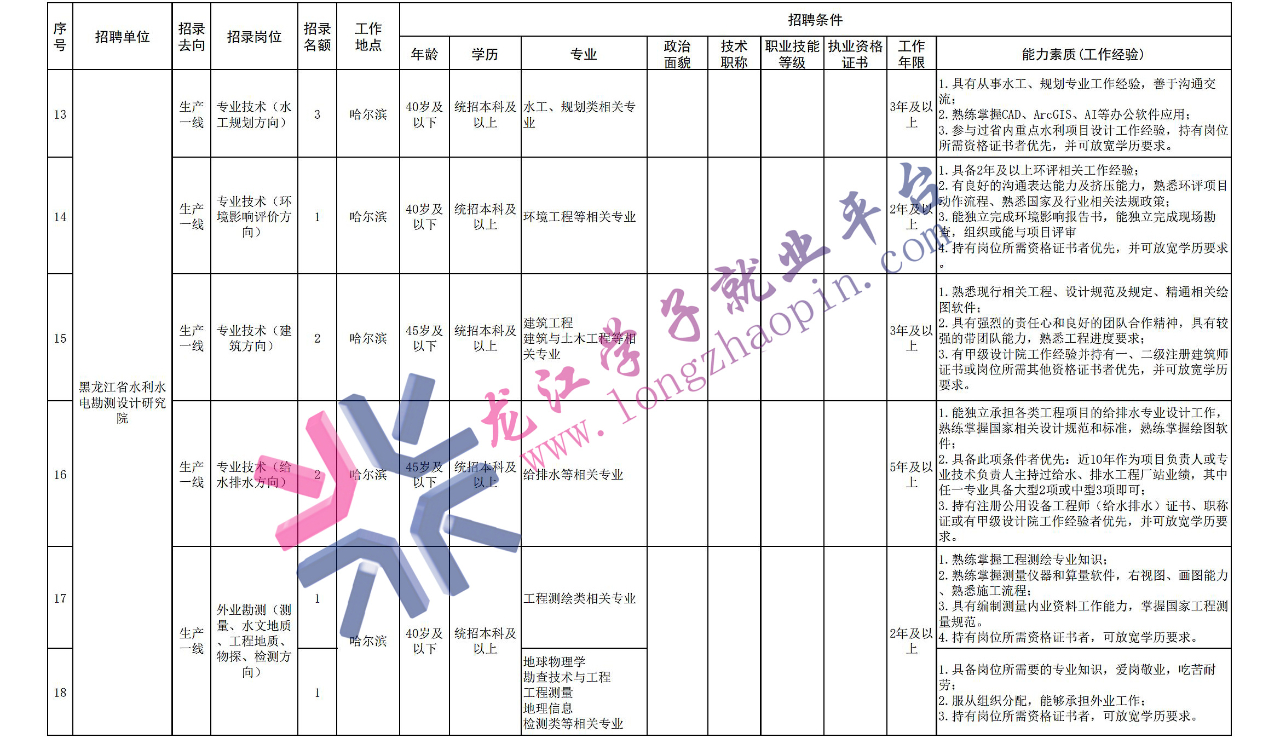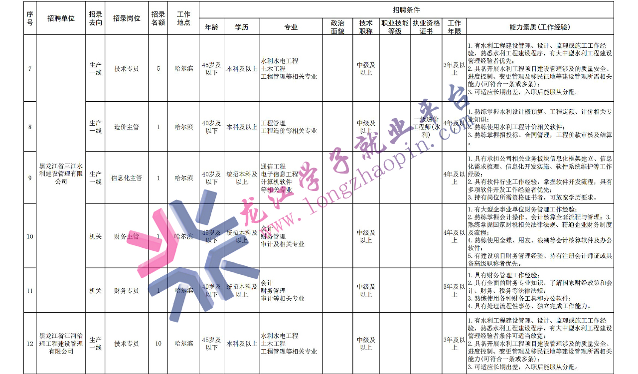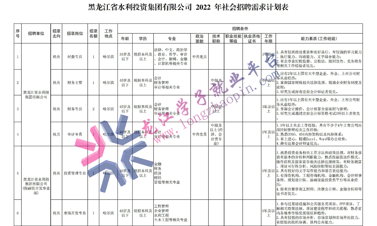 具体招聘岗位及岗位要求详见《黑龙江省水利投资集团有限公司2022年社会招聘需求计划表》。