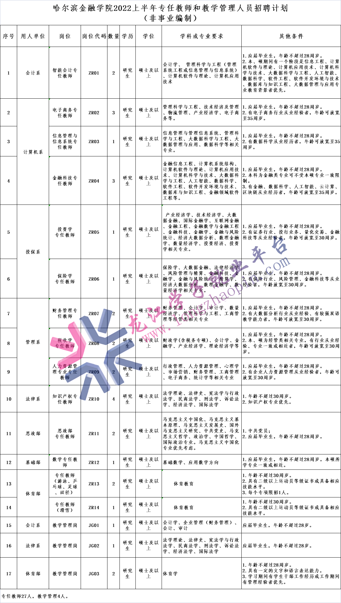 招聘人数详见附件1-《哈尔滨金融学院2022上半年专任教师和教学管理人员招聘计划(非事业编制)》。
