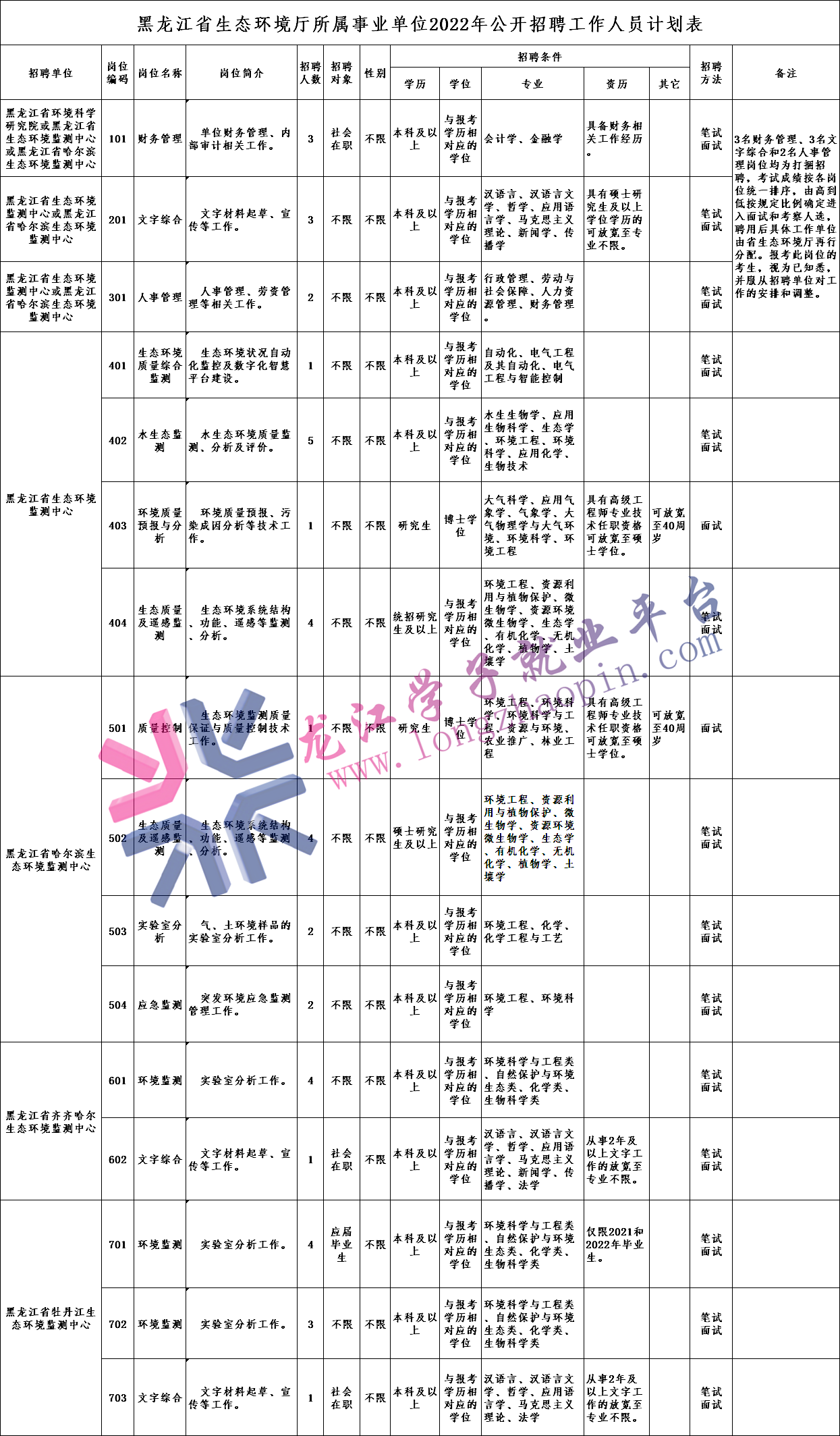 具体详见《黑龙江省生态环境厅所属事业单位2022年公开招聘工作人员计划表》(附件)