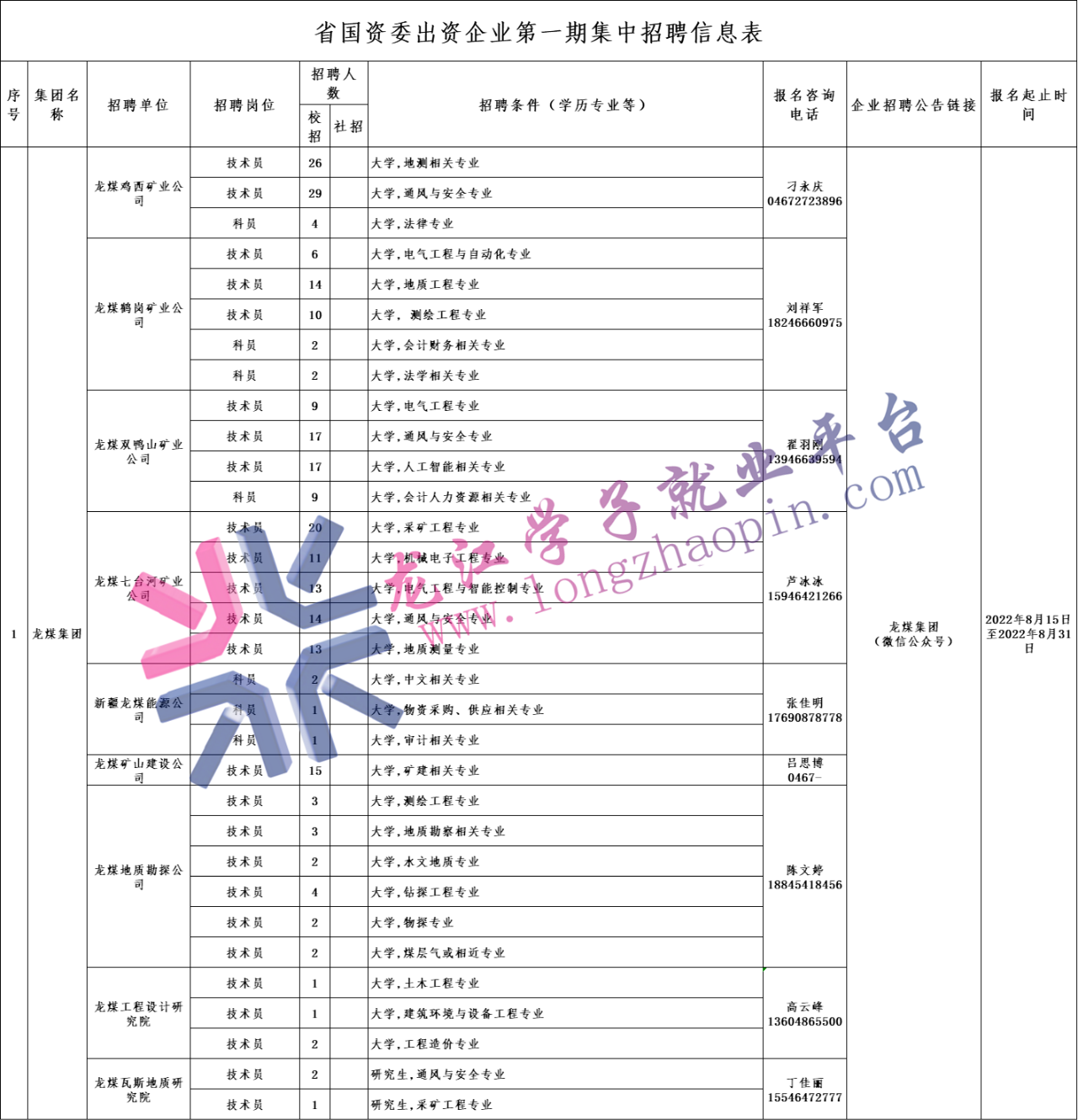 (一)具体招聘单位、招聘岗位、招聘条件、报名咨询电话、招聘公告链接、报名起止时间等信息详见《省国资委出资企业第一期集中招聘信息表》(附件),应聘人员如有疑问,可直接与招聘企业联系。