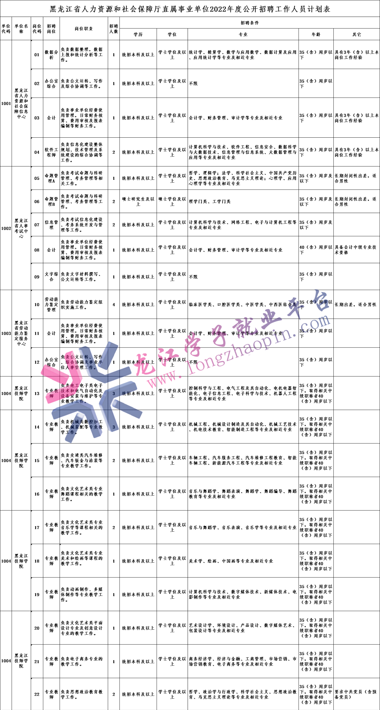 具体岗位详见《黑龙江省人力资源和社会保障厅直属事业单位2022年度公开招聘工作人员计划表》(见附件1,以下简称《计划表》)。