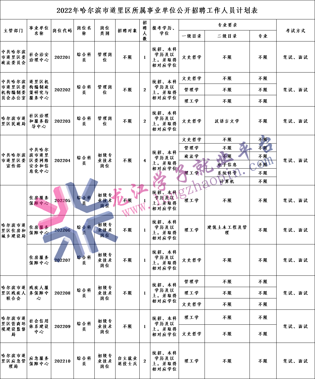 本次招聘笔试和面试工作均由哈尔滨市道里区人力资源和社会保障局负责组织实施。