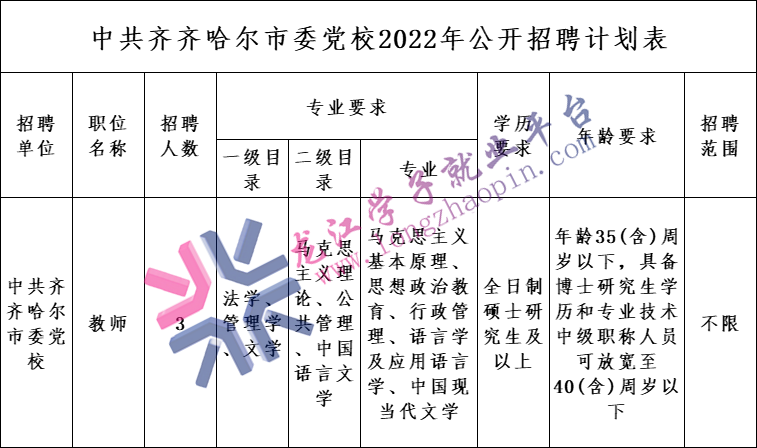 为加强师资队伍建设,根据《黑龙江省事业单位公开招聘工作人员实施细则》及市委编办关于市委党校编制使用计划的批复,市委党校拟面向社会公开招聘事业单位工作人员3名,现就有关事宜公告如下。