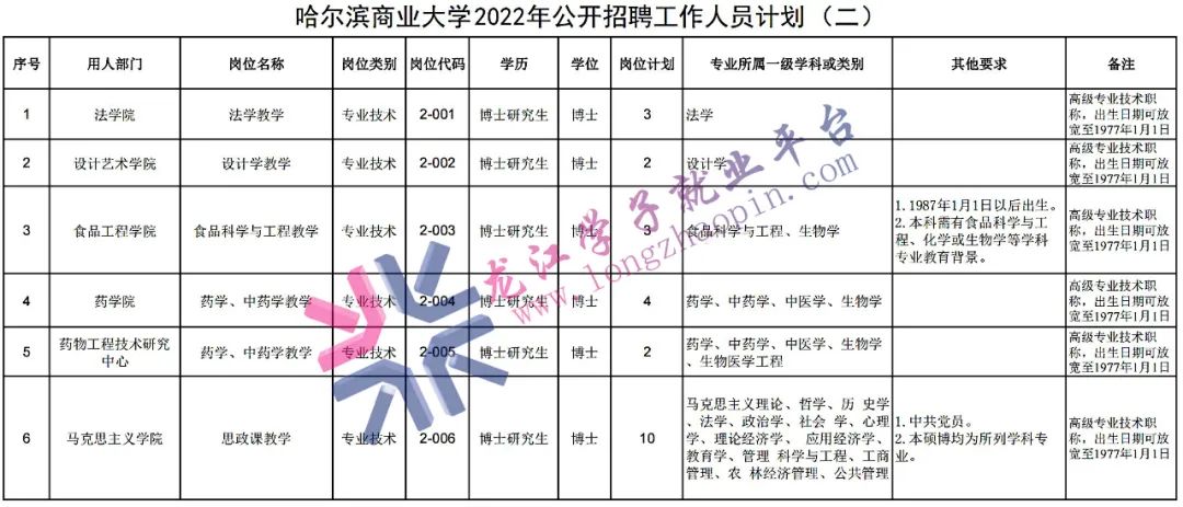 (六)各岗位的具体要求,详见《哈尔滨商业大学2022年上半年公开招聘工作人员计划(二)》(附件1)。