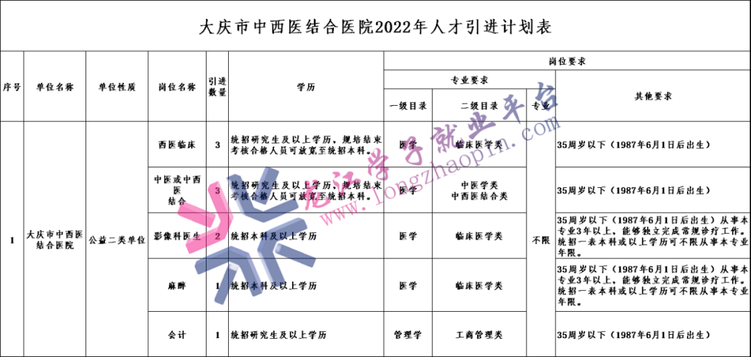 计划引进10人,具体招聘计划详见《大庆市中西医结合医院2022年人才引进计划表》(附件1)。