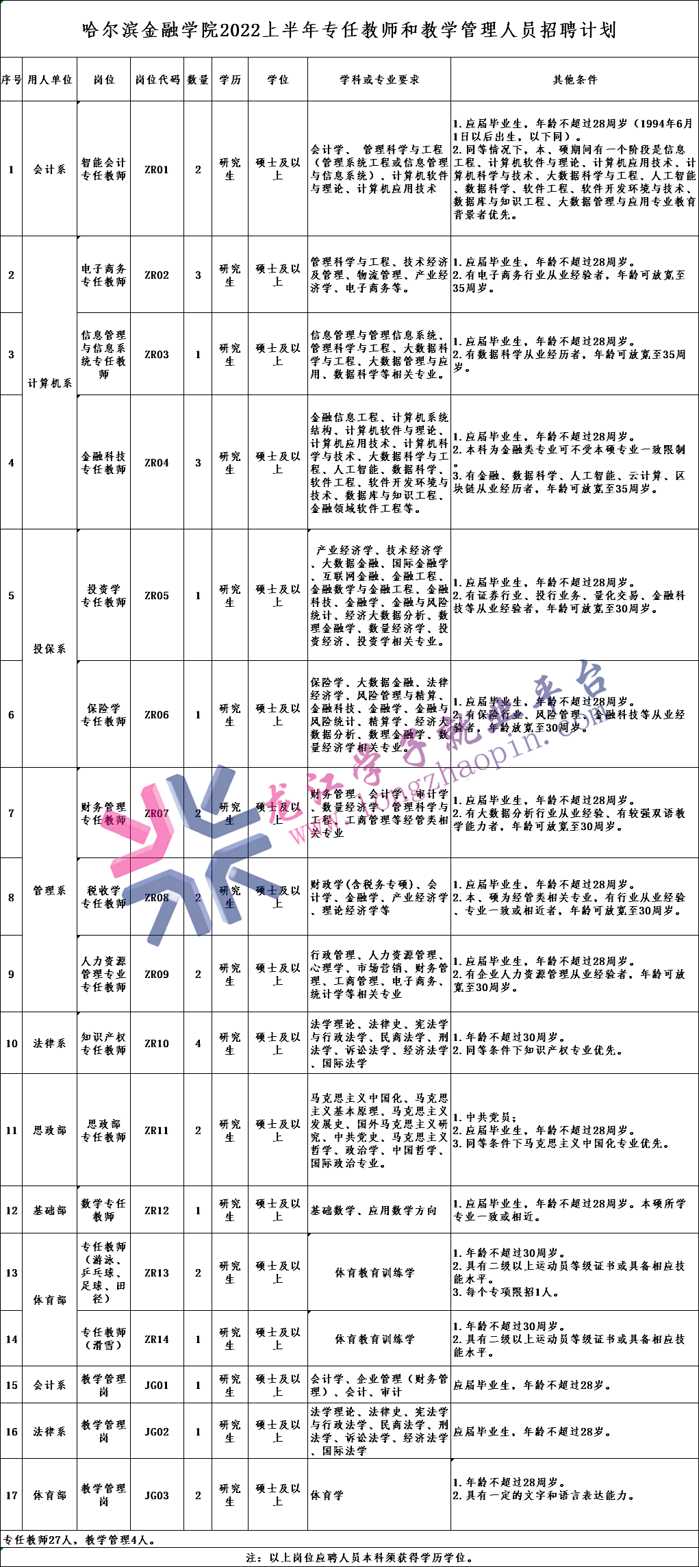 招聘人数详见附件1-《哈尔滨金融学院2022上半年专任教师和教学管理人员招聘计划》。