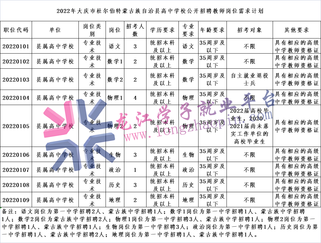 计划招聘高中教师22人,具体详见《2022年大庆市杜尔伯特蒙古族自治县高中学校公开招聘教师岗位需求计划》(附件1)。