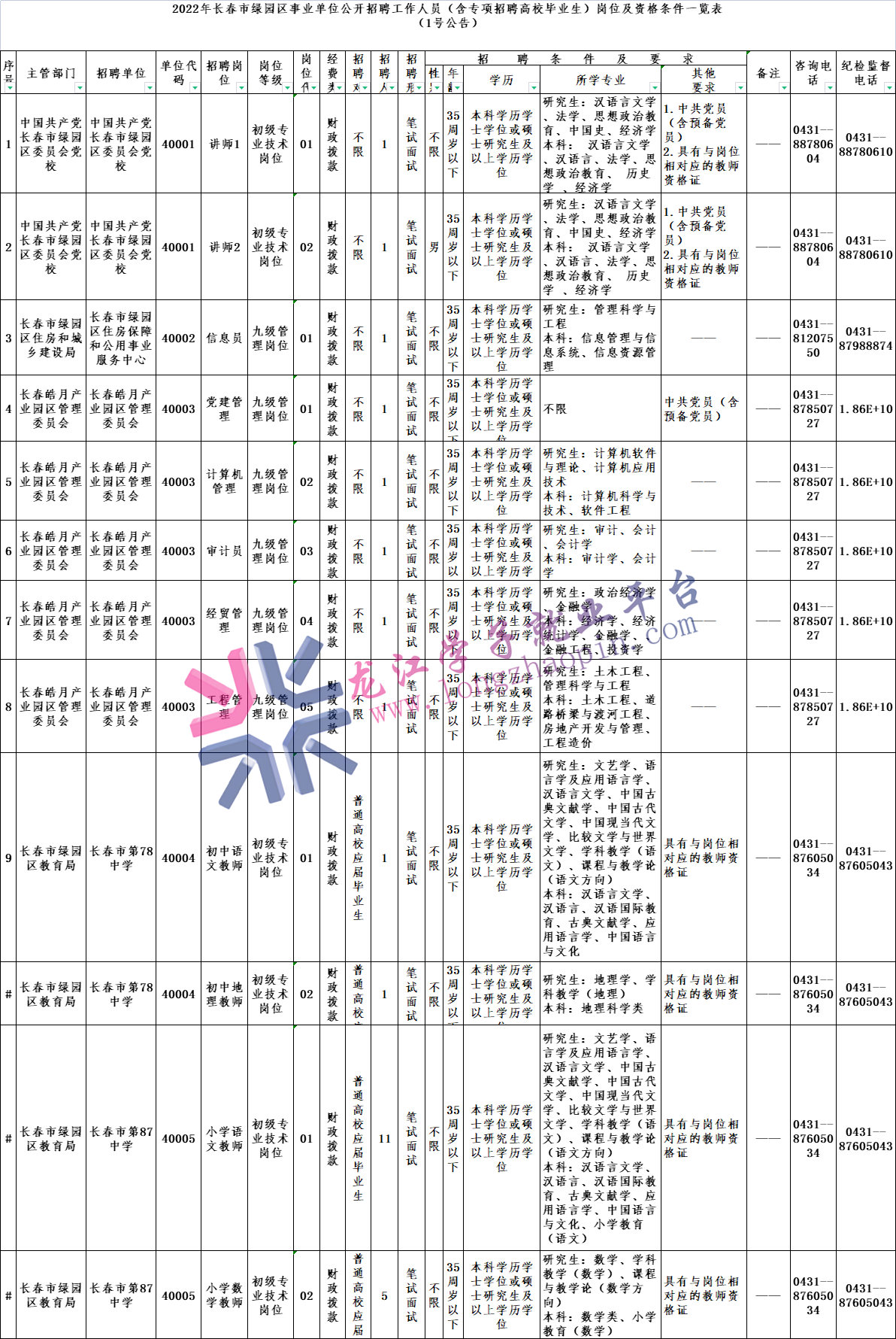 1.符合岗位所要求的学历、学位、专业等其他条件(代课教师不受此项条件限制)。详见(附件1):《2022年长春市绿园区事业单位公开招聘工作人员(含专项招聘高校毕业生)岗位及资格条件一览表》(1号公告)。