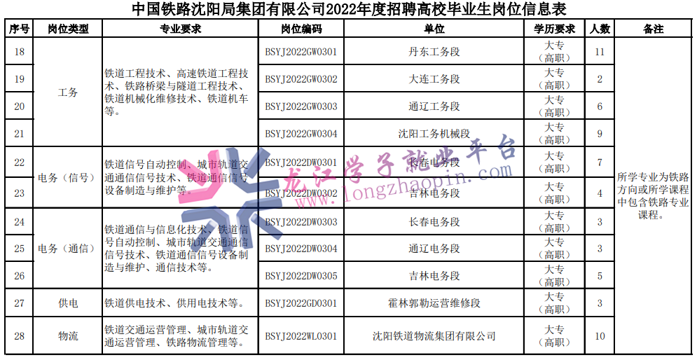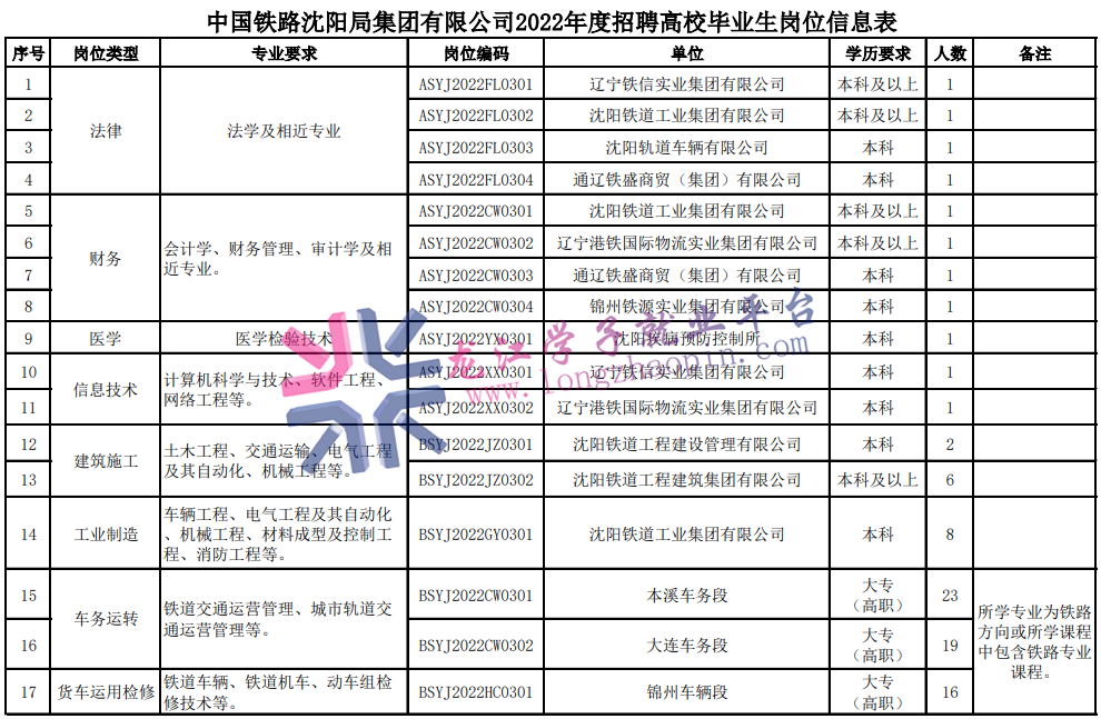 中国铁路沈阳局集团有限公司根据企业发展需要,拟招聘普通高等院校大专(高职)及以上学历毕业生,现将有关事项公告如下: