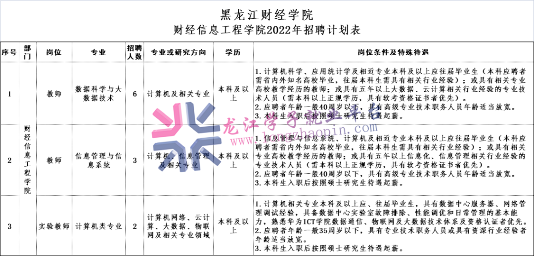 各招聘岗位招聘具体条件,详见《黑龙江财经学院财经信息工程学院2022年招聘计划表》(附件1)。
