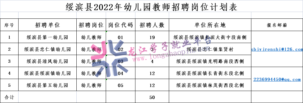 本次计划招聘50名幼儿园教师,具体招聘单位、岗位、人数详见《绥滨县2022年幼儿园教师招聘岗位计划表》(附件1)。